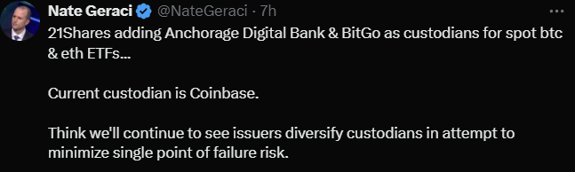 - "Anchorage Digital and BitGo join Coinbase as custodians for 21Shares US spot products, including the ARK 21Shares Bitcoin ETF, ARKB, and the 21Shares Core Ethereum ETF, CETH," announced 21Shares.