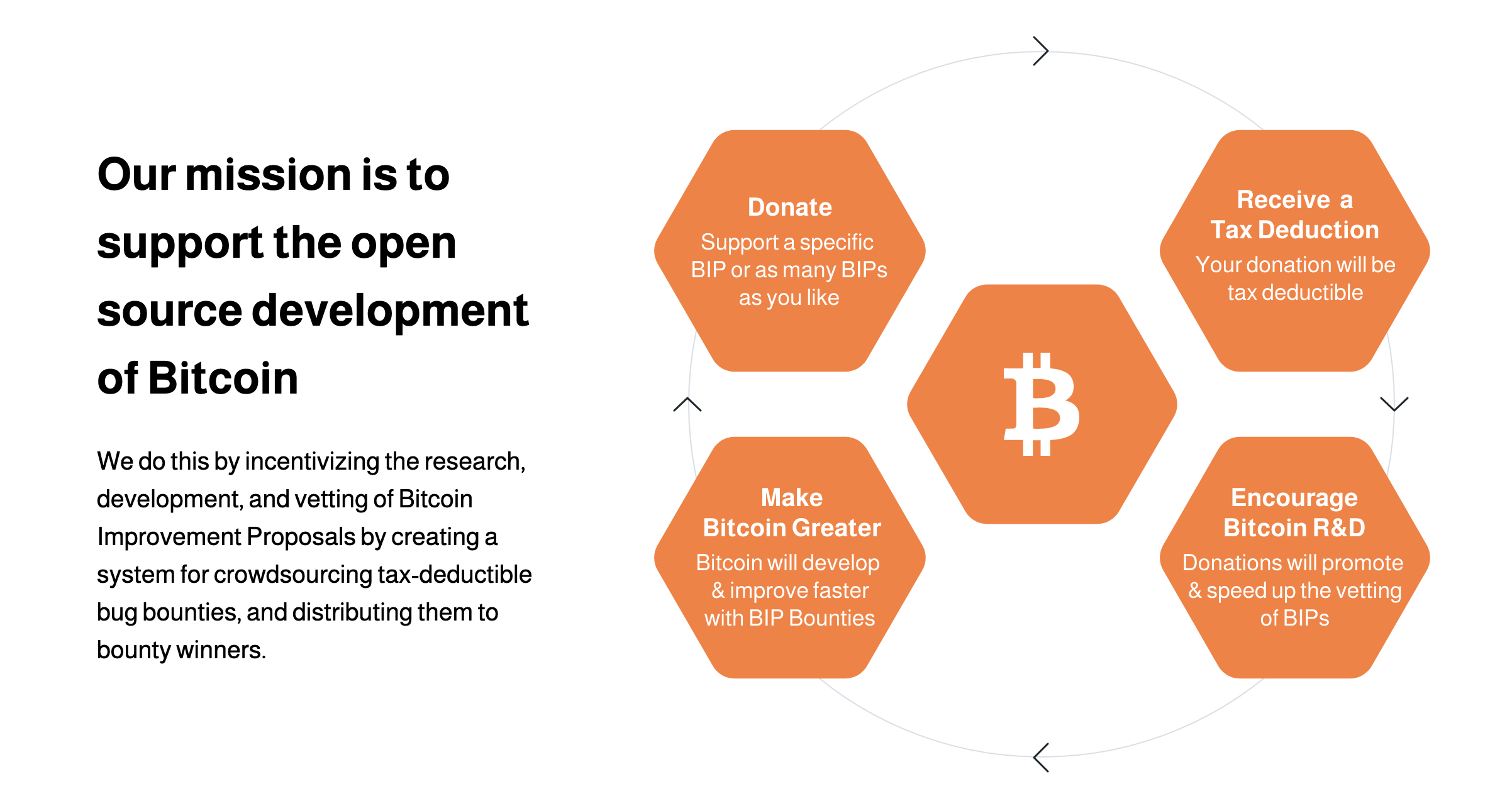 * Incentivize the research, development, and vetting of Bitcoin Improvement Proposals by implementing a system for crowdsourcing tax-deductible bug bounties https://bipbounty.org/archive: https://archive.ph/dJSRU