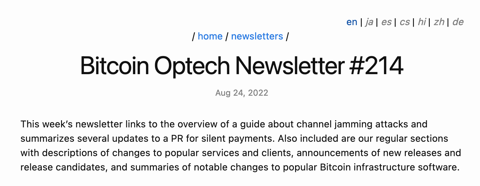 * guide about channel jamming attacks * updates to a silent payments PR * changes to services & client software * adds a silent payments topic https://bitcoinops.org/en/newsletters/2022/08/24/archive: https://archive.ph/usjJz