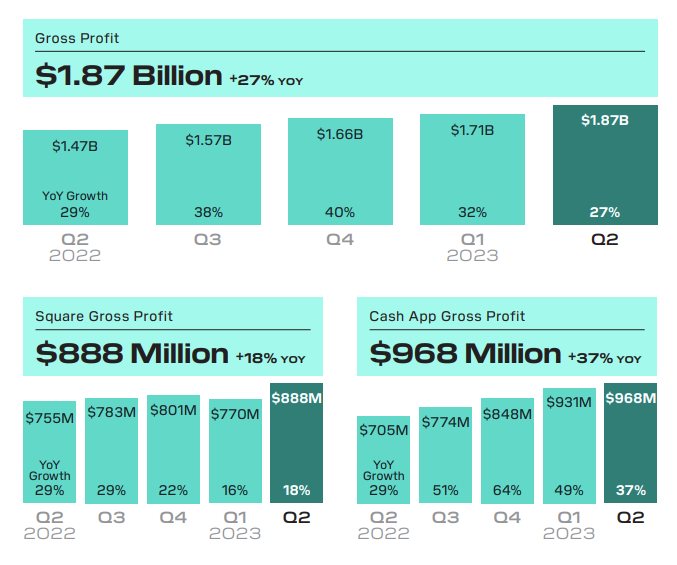 - "In the second quarter of 2023, we [Block] generated gross profit of $1.87 billion, up 27% year over year. Square generated gross profit of $888 million, up 18% year over year, and Cash App generated gross profit of $968 million, up 37% year over year."
