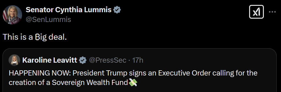 - Donald Trump signs an executive order to create a US Sovereign Wealth Fund. President Donald Trump signed an executive order instructing the Treasury and Commerce Departments to establish a U.S. sovereign wealth fund. He assigned Treasury Secretary Scott Bessent and Commerce Secretary Howard Lutnick the task of developing the foundation for the fund, which will likely need congressional approval. Senator Cynthia Lummis suggested on X that this could be significant for Bitcoin.