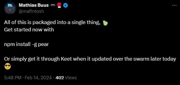 - "Among these: https://github.com/holepunchto/pear - the runtime. This is an insane piece of engineering led by @davidmarkclem . Run apps from the swarm, live anywhere in the world - unstoppable."