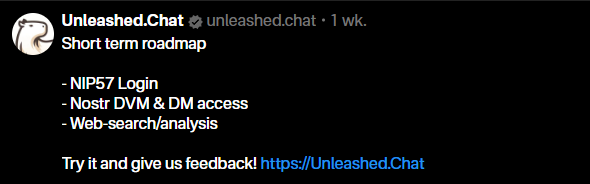 Unleashed Chat is an AI chatbot service designed with real privacy in mind. It supports live Nostr data querying and advanced context embedding capabilities. The service accepts Bitcoin payments (both on-chain and via the Lightning Network).