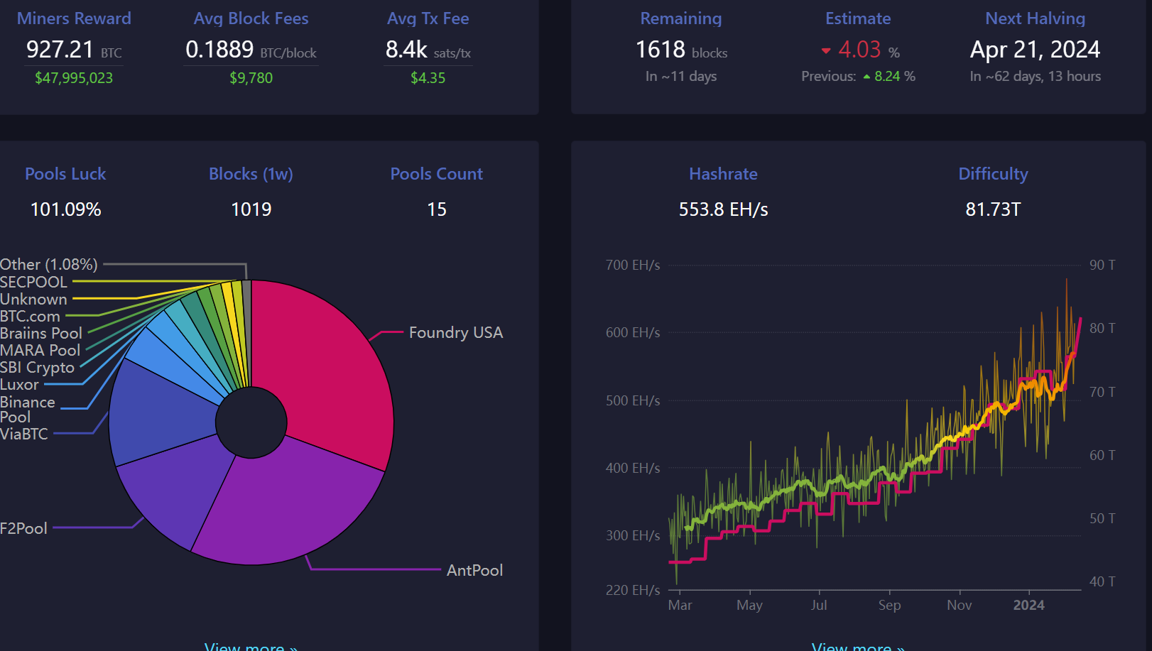 - The network's hashrate (7-day SMA) is currently at ~568 EH/s.