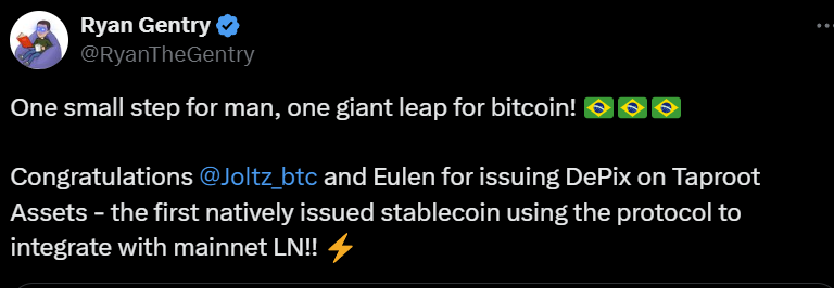 - Joltz and Eulen to launch the first stablecoin on the Lightning Network using Taproot Assets. DePix will be Brazil's first Taproot-based stablecoin, bridging the Lightning Network with the country's PIX payment system.