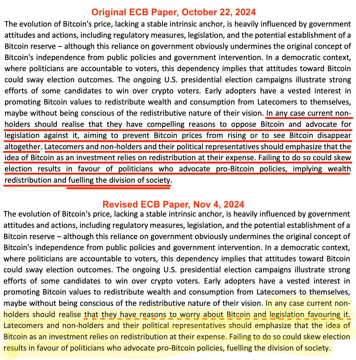 - ECB economists soften wording in the latest anti-bitcoin paper. The last paragraph now reads: "Current non-holders should realise that they have reasons to worry about Bitcoin and legislation favoring it" instead of "Current non-holders should realize that they have compelling reasons to oppose Bitcoin and to advocate for legislation against it, aiming to prevent bitcoin prices from rising or to see Bitcoin disappear altogether," along with a few other changes.