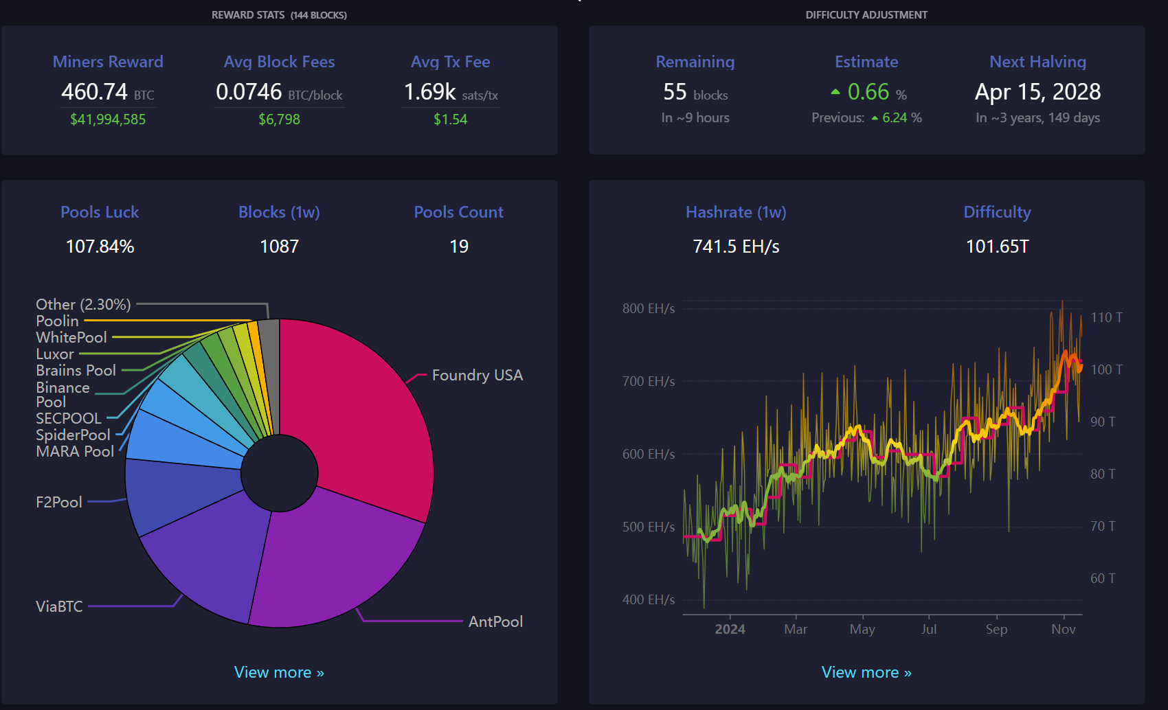 - Bitcoin mining difficulty is set to adjust in ~9 hours. Currently, the network's average hashrate (7-day SMA) is at ~723 EH/s.