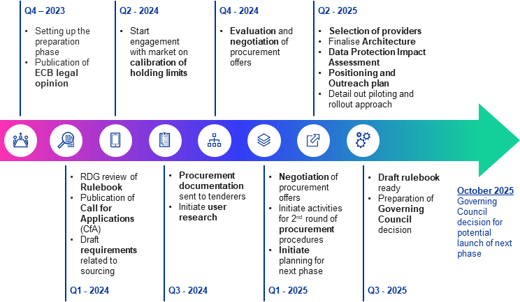 - The European Central Bank has released its second progress report on the preparatory stage of the digital euro. Current discussions are focused on potential wallet limits, legal harmonization, design issues, and ongoing research. This report marks a midpoint in the preparatory phase, following the investigative and design stages.