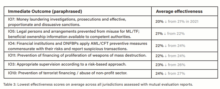 - Countries' AML frameworks are more technically compliant but less effective in practice, states Basel AML Index 2024. "In contrast to the modest progress in technical compliance with the FATF Recommendations, the average effectiveness of AML measures globally as measured by the FATF remains at the low level of 28 percent, down from 30 percent in 2021," was stated in the report.