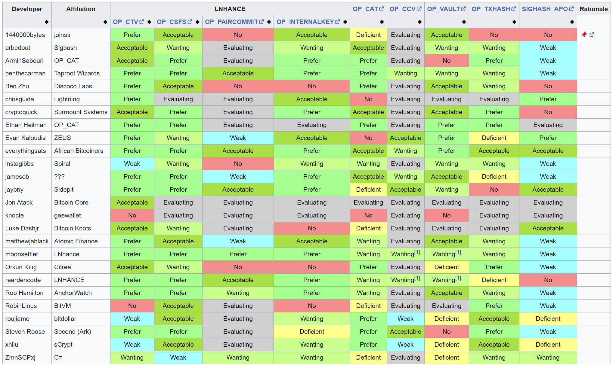 - Covenants support list on Bitcoin Wiki documents Bitcoin developers' preferences for various Covenants support proposals.