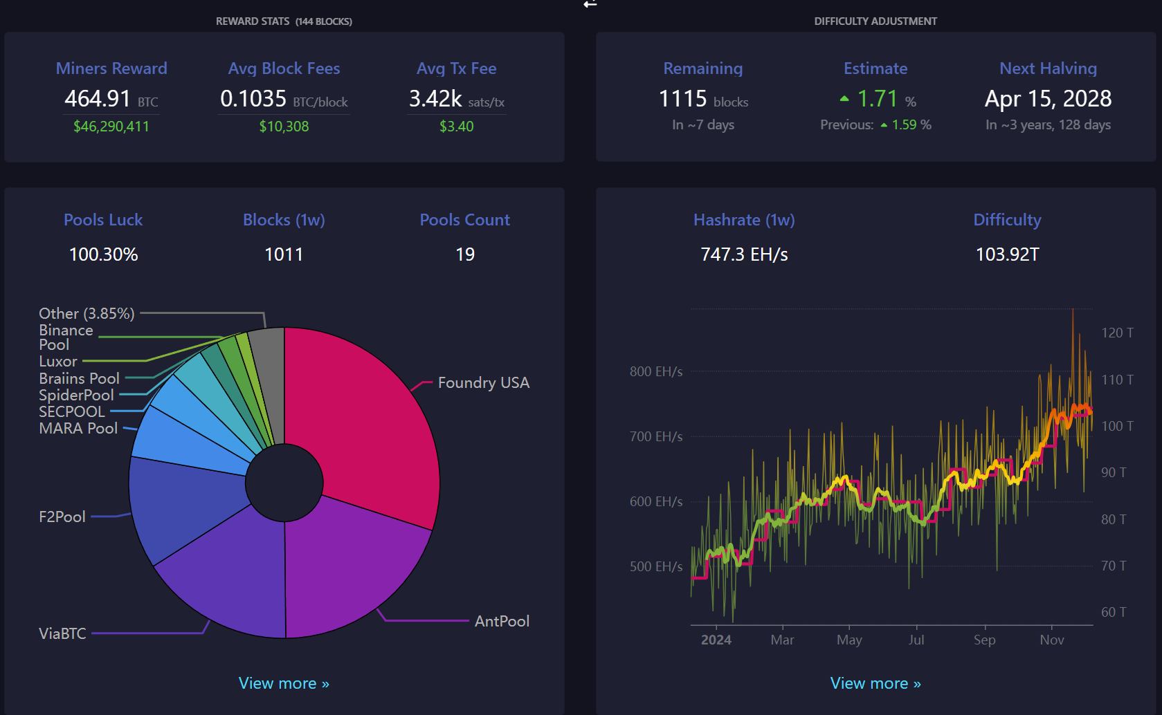 - Bitcoin mining difficulty has reached a new all-time high, now standing at 103.92T.