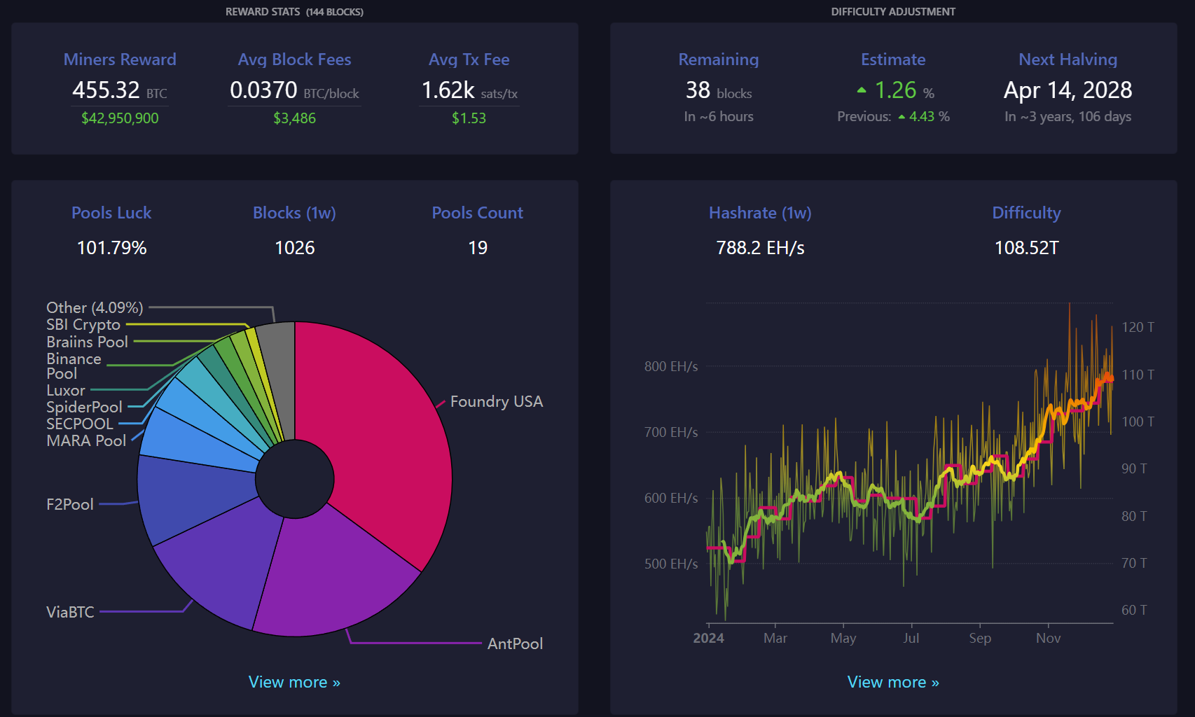 - The hashrate of the Bitcoin network is currently at ~777 EH/s.