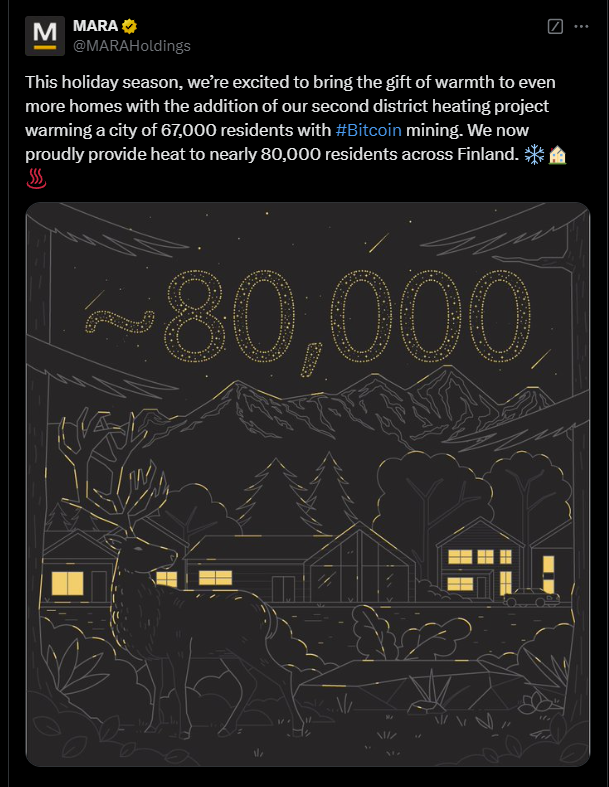 - Bitcoin miner Marathon Digital is now heating 80,000 homes in Finland. The initiative, launched in June with a pilot program benefiting 11,000 households in the Satakunta area, has scaled up to serve an additional 67,000 residents. This system utilizes district heating technology to circulate heat via an underground network of pipes, transforming what was once waste into a valuable resource for the city, reports Atlas21.