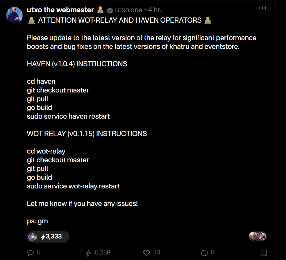 - WoT relay v0.1.15 and Haven relay v1.0.3 have been released.