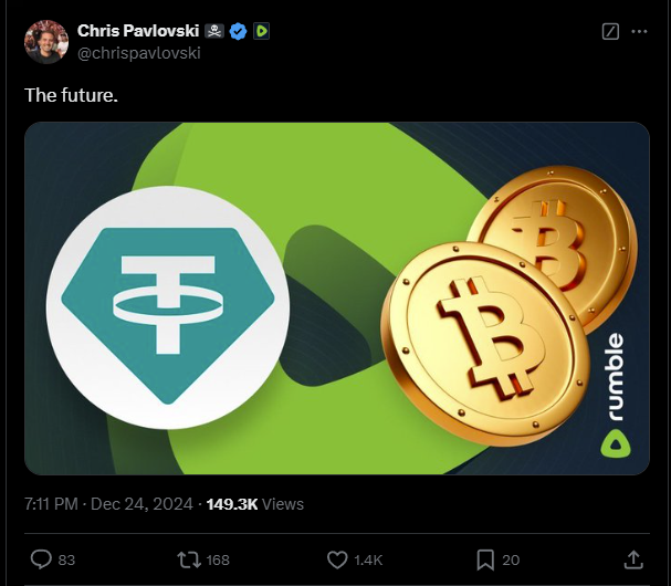 - Rumble CEO teases BTC and USDT tips on the platform. Chris Pavlovski, CEO of YouTube rival Rumble, has hinted at a potential Bitcoin tipping feature for content creators following a $775 million partnership with Tether, the issuer of the largest stablecoin, USDT.