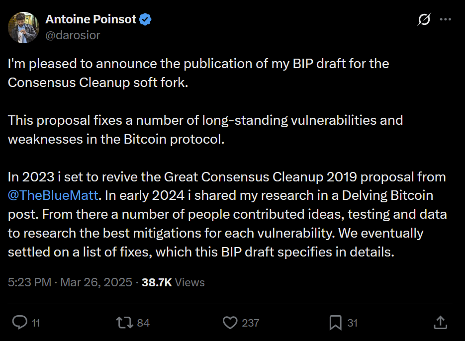 - Antoine Poinsot has shared a BIP draft for the Consensus Cleanup soft fork.
