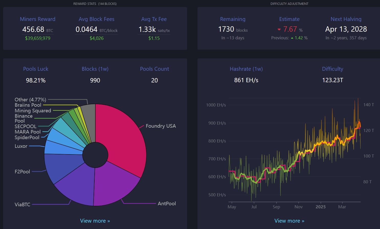- The network's hashrate (7-day simple moving average) is currently at 876 EH/s.