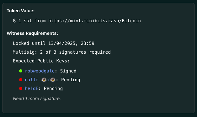 - Cashu Witness enables unlocking a locked Cashu token by signing with a private key (Nostr nsec or P2PK). It supports multisig tokens, displaying whose signature(s) are required to unlock. Partially signed tokens can be sent to other signatories for completion. Once fully signed, the token can be swapped at the mint for an unlocked, spendable version.