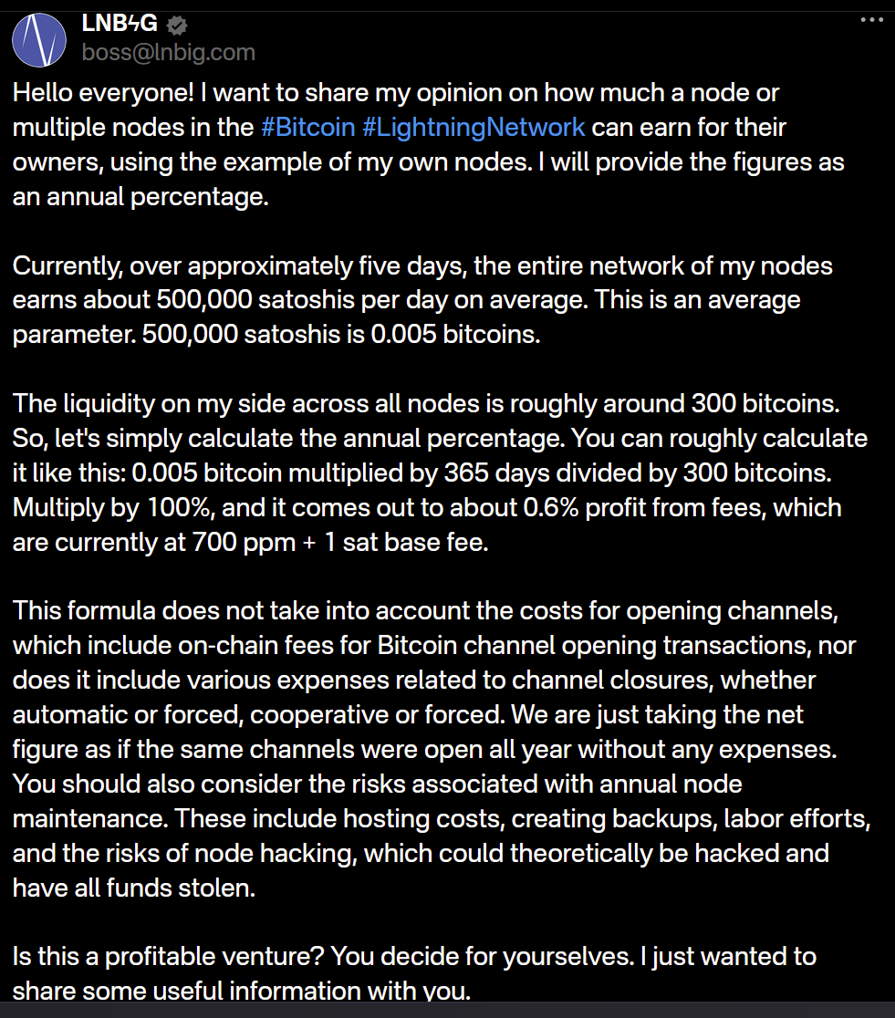 - LNDg v1.10.0, an advanced web interface designed for analyzing Lightning Network Daemon (LND) data and automating node management tasks, introduces performance improvements, adds a new metrics page for unprofitable and stuck channels, and displays warnings for batch openings. The Profit and Loss Chart has been updated to include on-chain costs. Advanced settings have been added for users who would like their channel database size to be read remotely (the default remains local). Additionally, the AutoFees tool now uses aggregated pubkey metrics for multiple channels with the same peer.