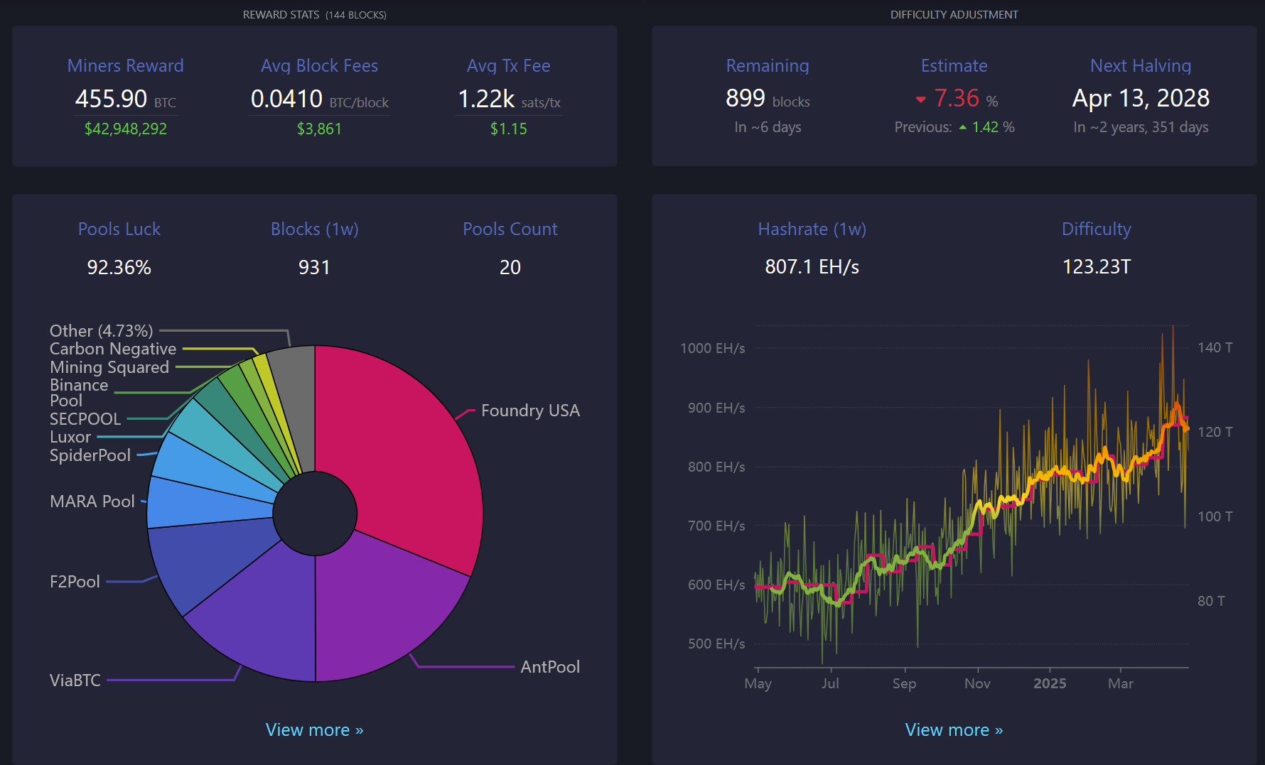 - The Bitcoin network's hashrate (7-day simple moving average is currently at ~861 EH/s. Next difficutly adjustment is expected in 6 days.
