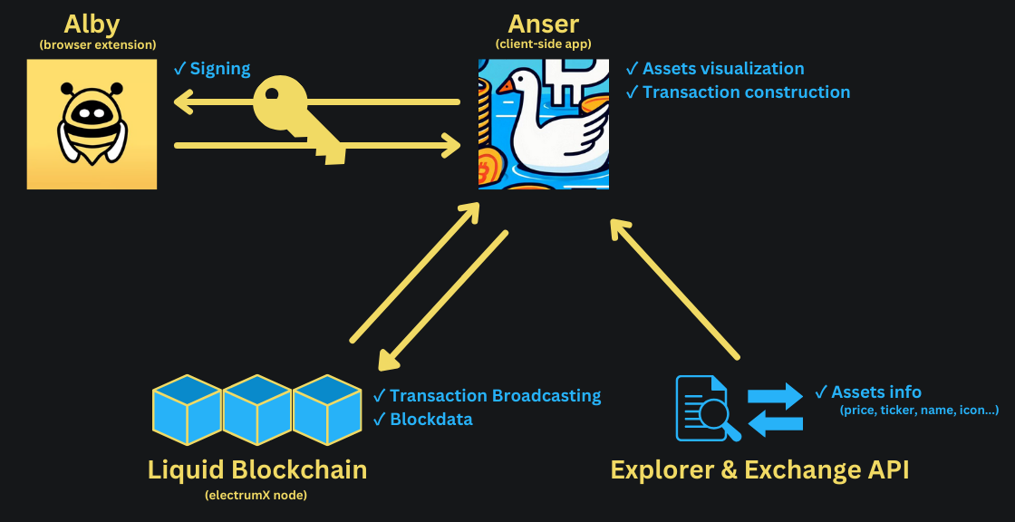 Anser is a free and open-source client-side web app that uses the Alby extension's Liquid integration to provide a simple interface to the Liquid Network.