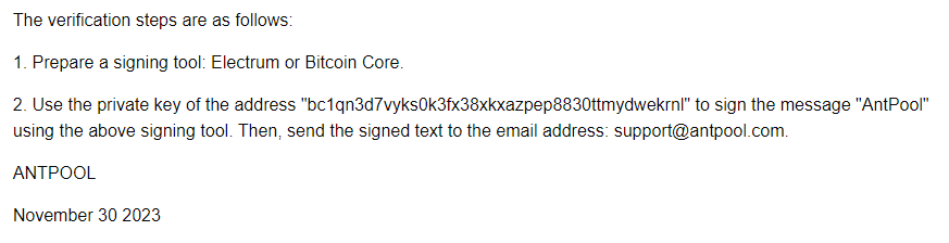 - "On November 23rd, some user submitted 83 BTC as a gas fee. The risk control system of ANTPOOL temporarily froze the fee when packaging the transaction. Please contact us before 00:00 (UTC+8) on December 10, 2023 and verify personal identity in the following way. After verification, ANTPOOL will refund the fee," reads the message from the KYC mining pool.