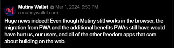 "We have received requests to continue to offer support for Home Screen web apps in iOS, therefore we will continue to offer the existing Home Screen web apps capability in the EU. This support means Home Screen web apps continue to be built directly on WebKit and its security architecture, and align with the security and privacy model for native apps on iOS."