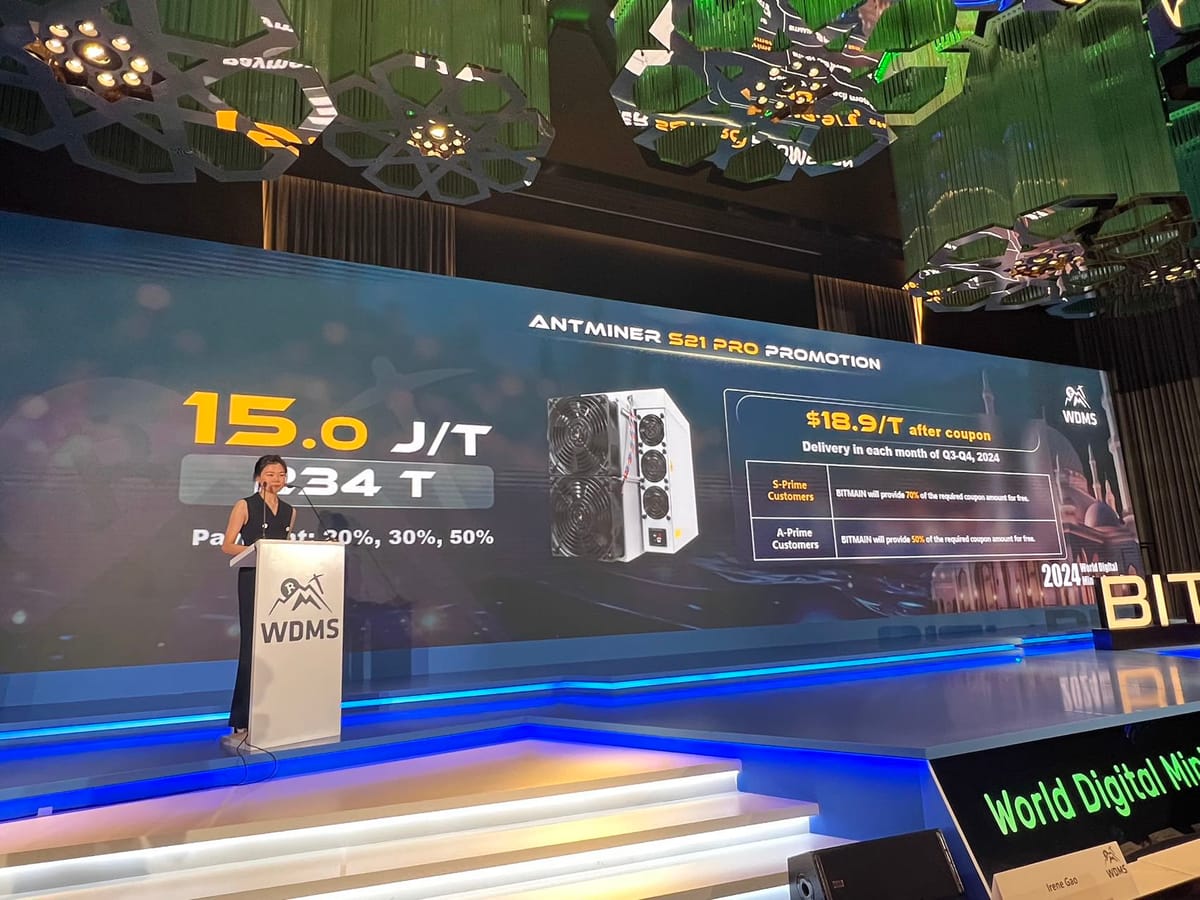 Bitcoin mining hardware manufacturer Bitmain announced the launch of the Antminer S21 Pro at the Global Digital Mining Summit (WDMS) 2024.