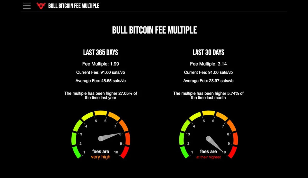 Bull Bitcoin Fee Multiple is a simple technical indicator which can help people assess whether current bitcoin network fees are low or high.