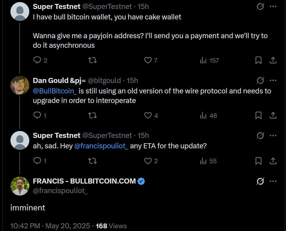- Bull Bitcoin Wallet v0.4.0 introduced Payjoin v2 support in late December 2024. However, the current implementations are not interoperable at the moment, an issue that should be addressed in the next release of the Bull Bitcoin Wallet.