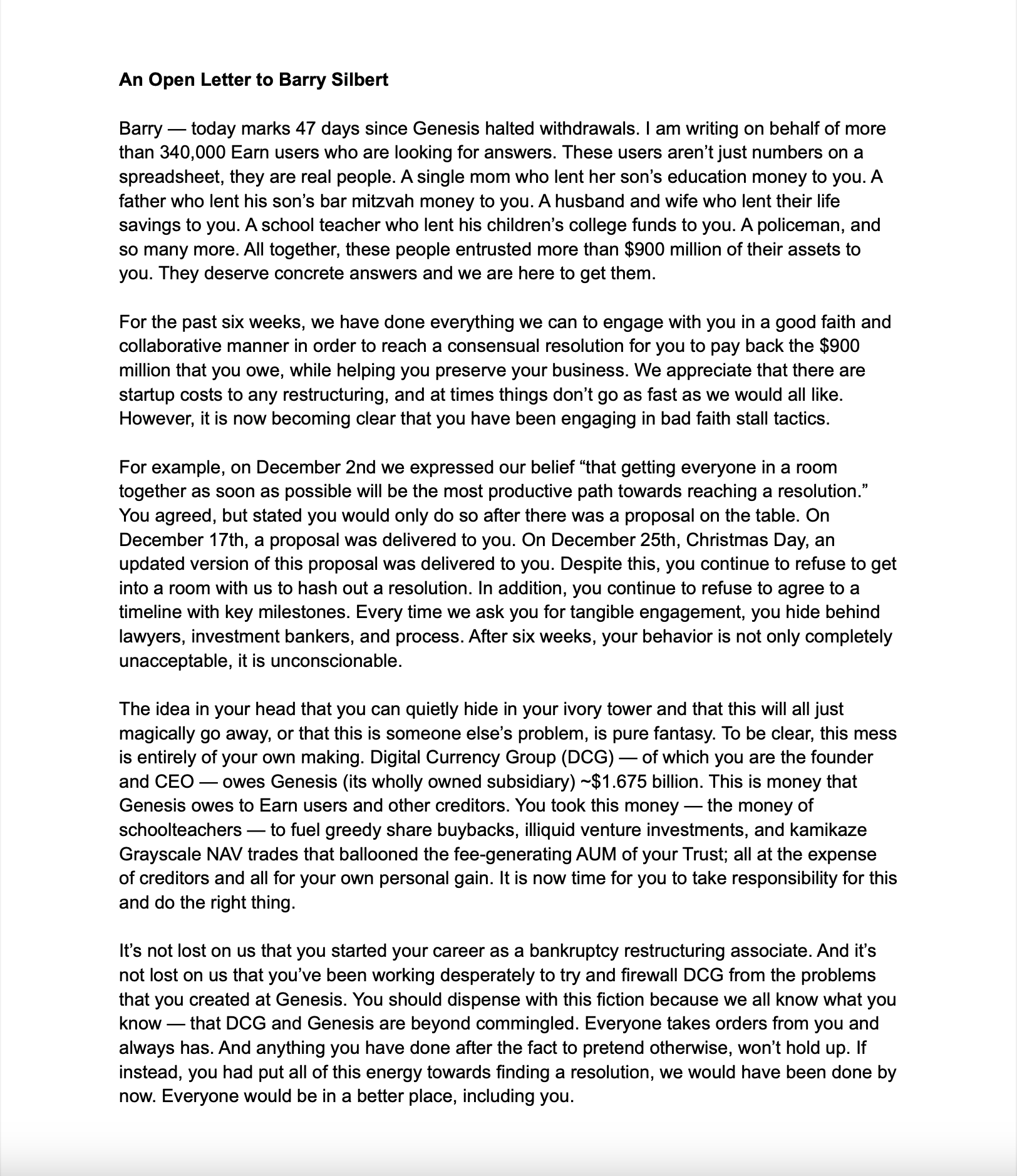 Gemini Cofounder Cameron Winklevoss Public Letter Claims Barry Silbert and DCG Have Not Cooperated to Recover Funds for Gemini Earn Customers: Withdrawals Have Been Frozen for 47 Days