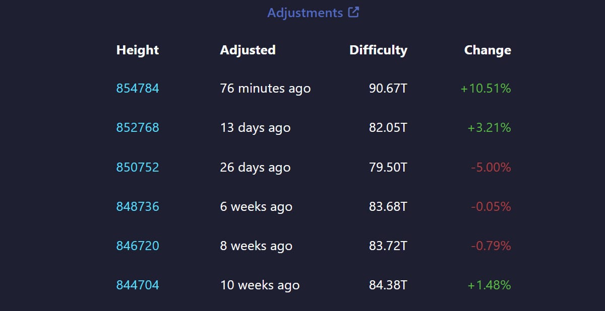 - Bitcoin mining difficulty has risen by 10.51% today, reaching a new all-time high of 90.67T.