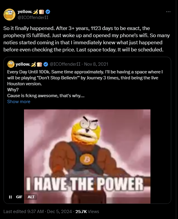 GOOOOOOOOD MORNING, BITCOIN! Today is December 5th, 2024, and marks the day when Bitcoin surpassed $100,000 in USD terms. According to Bitbo, today also marks Gold Parity Day for Bitcoin, as its price reached parity with gold on December 5th, 2013.