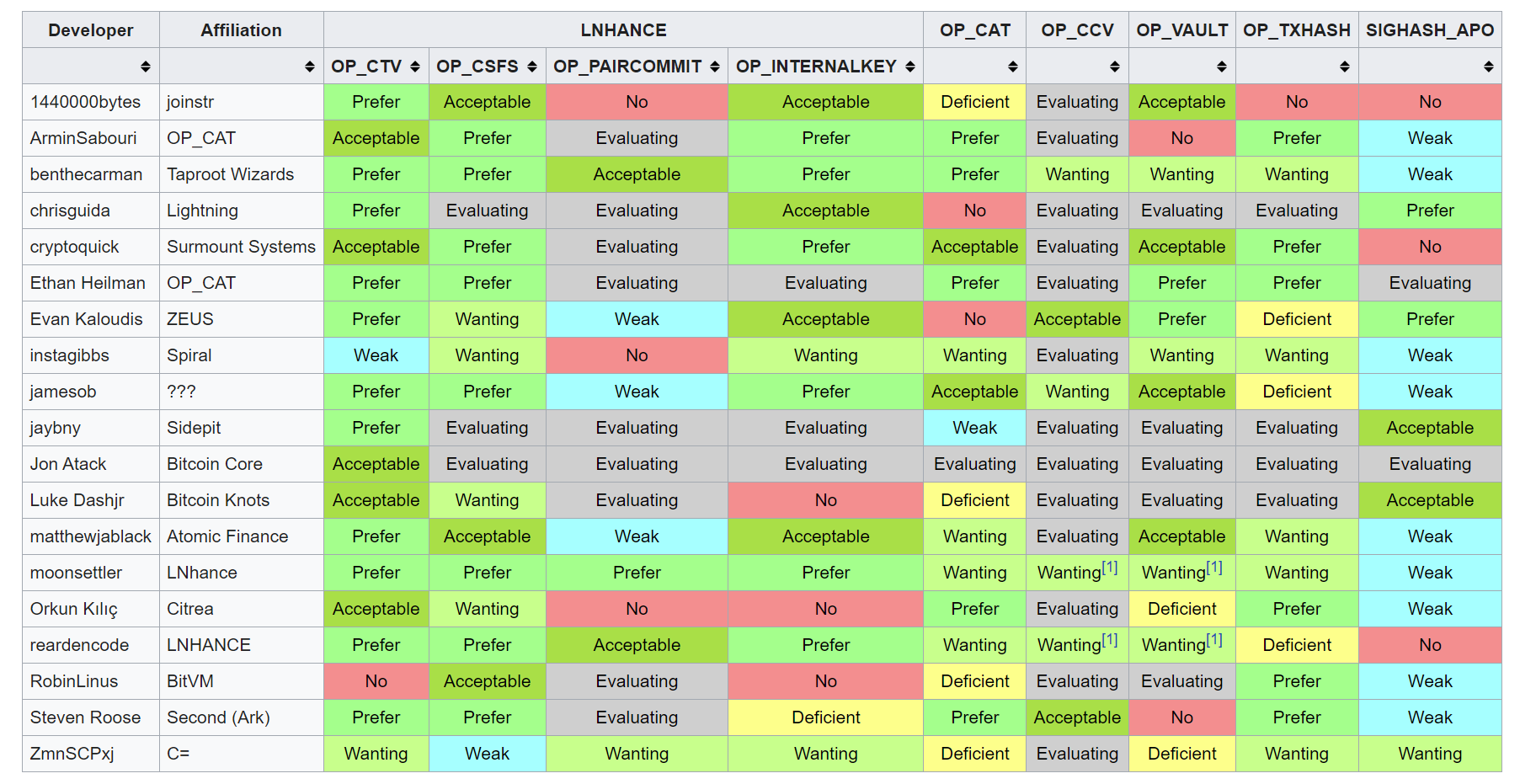 - Covenants support list on Bitcoin Wiki documents Bitcoin developers' preferences for various Covenants support proposals.