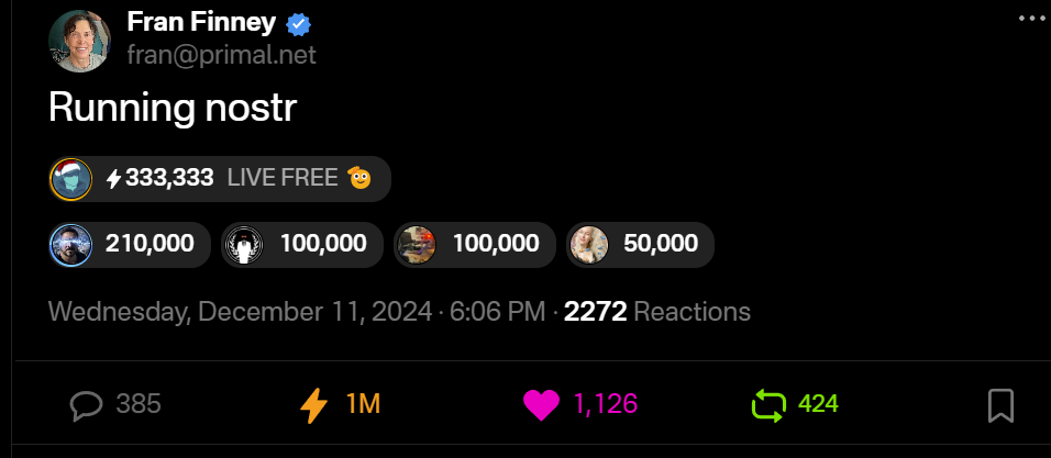 - Fran Finney joins Nostr, earns over 1 million sats. Fran Finney, the wife of Bitcoin legend Hal Finney—the first Bitcoin transaction recipient—has joined Nostr and earned over 1 million sats.