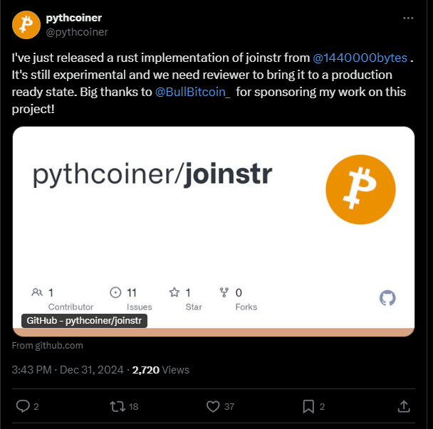 - An experimental Rust implementation of Joinstr, developed by pythcoiner, is now available here. The development of this project is sponsored by Bull Bitcoin.