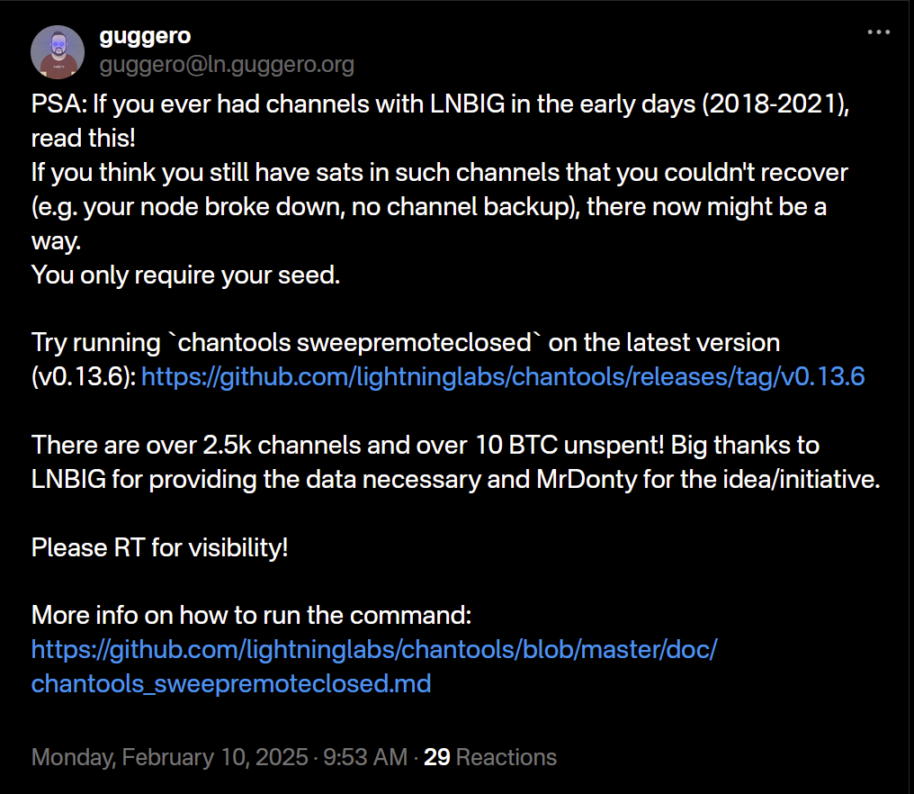 - Chantools v0.13.6, a tool with helper functions for rescuing funds locked in LND channels, comes with the ability to add commit points for ancient channels of LNBIG.