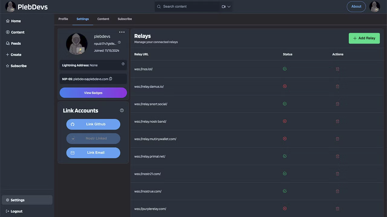 - PlebDevs, a developer education platform built on the Nostr protocol and Lightning, implemented multi-account linking.