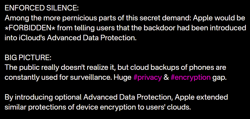 - UK orders Apple to create backdoor for encrypted iCloud accounts worldwide. Apple has received a secret order from the UK Home Secretary's office requiring the company to provide access to any user data protected by its Advanced Data Protection for iCloud. Apple might withdraw support for Advanced Data Protection for iCloud in the UK instead of installing a backdoor.
