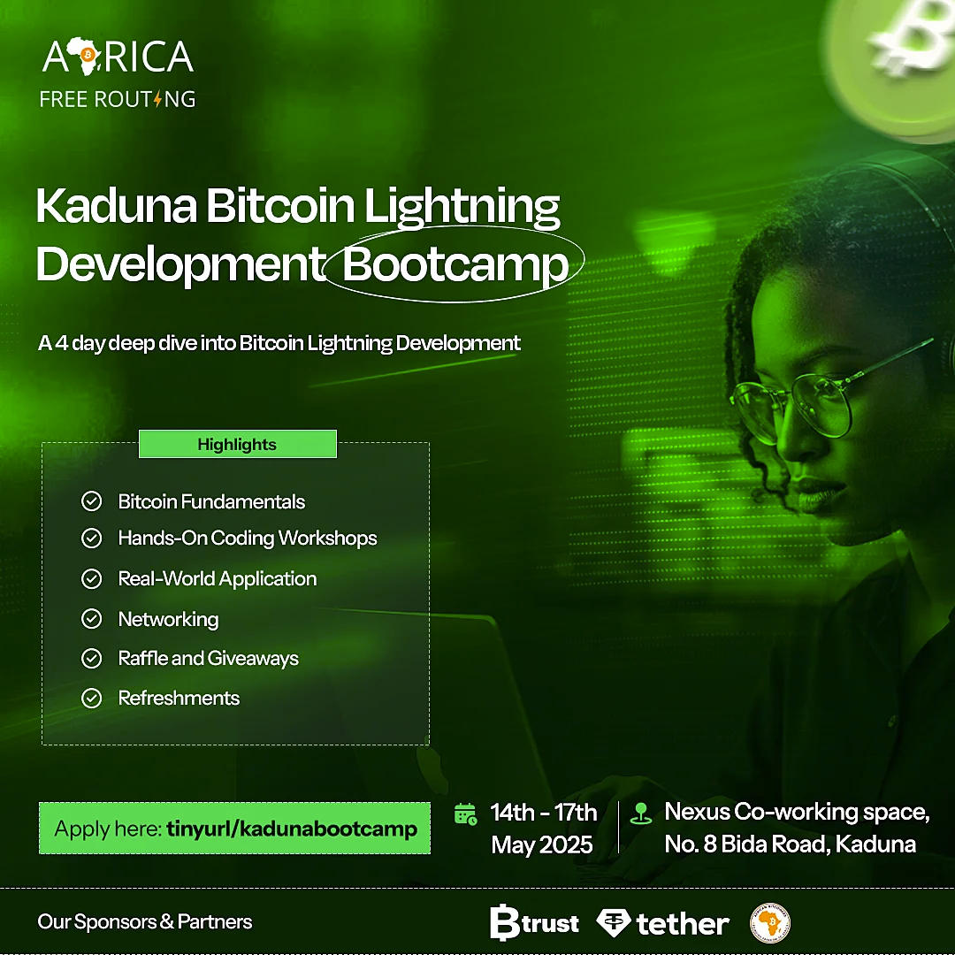 - Kaduna Lightning Development Bootcamp. From May 14th to 17th, the Bitcoin Lightning Developer Bootcamp will take place in Kaduna, Nigeria. Thisevent offers four dynamic days of coding, learning, and networking. Organized by Africa Free Routing and supported by Btrust, Tether, and African Bitcoiners, this bootcamp is designed as a gateway for African developers eager to advance their skills in Bitcoin and Lightning development. Apply here.