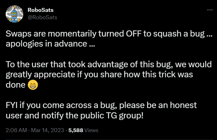 RoboSats, a Lightning Network peer-to-peer bitcoin exchange has temporarily turned off swaps due to a bug that reportedly allowed a user to steal nearly 5m sats.