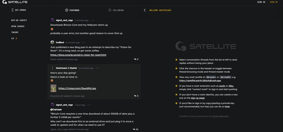 Alpha version of Satellite Nostr web client includes basic features and eye-pleasing design.