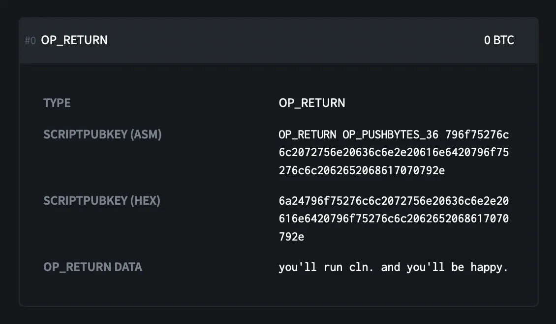 - Message in transaction said: "you'll run cln. and you'll be happy."