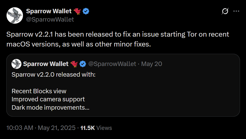 - Sparrow v2.2.1 is a bug fix release that addresses missing UUID issue when starting Tor on recent macOS versions, icons for external sources in Settings and Recent Blocks view, repackaged