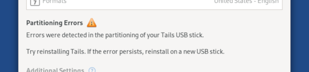 - Detection of partitioning errors. Tails USB partitions can corrupt, causing errors with Persistent Storage or upgrades due to faulty hardware, software issues, or improper removal. The software now warns earlier about these errors. If detected without Persistent Storage, it recommends reinstalling or using a new USB stick.
