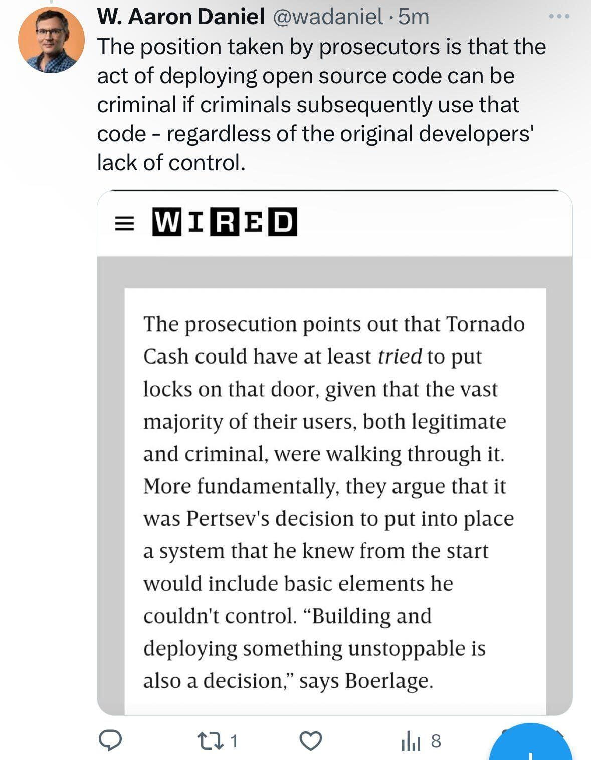 - Despite the prosecution of the protocol developers, Tornado Cash continues to function independently and processes privacy transactions to this day, reports Wired.