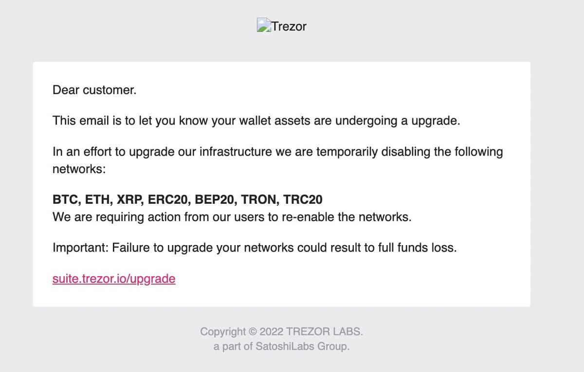 "If you received a suspicious email with the subject line 'Assets undergoing upgrade' from the ID: noreply@trezor.io, please do not click any links or provide any info within."