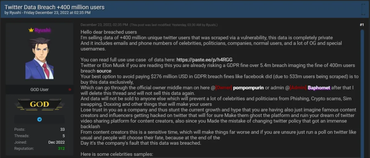 - A user that goes by the name of Ryushi posted a portion of the data on Breach Forum that includes celebrity phone numbers and emails.