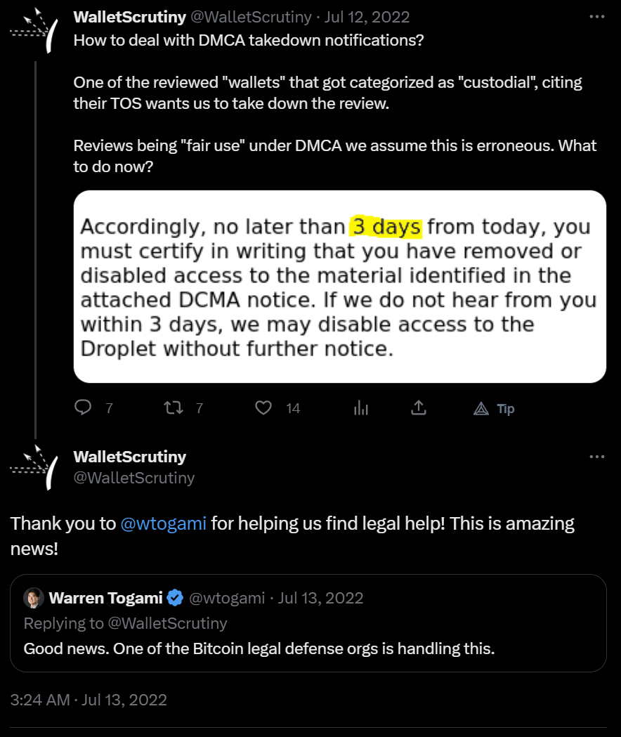 - WalletScrutiny.com faced a similar situation last year. Then, it received legal assistance by one of the Bitcoin legal defense organizations, per Warren Togami, VP of Solutions at Blockstream.