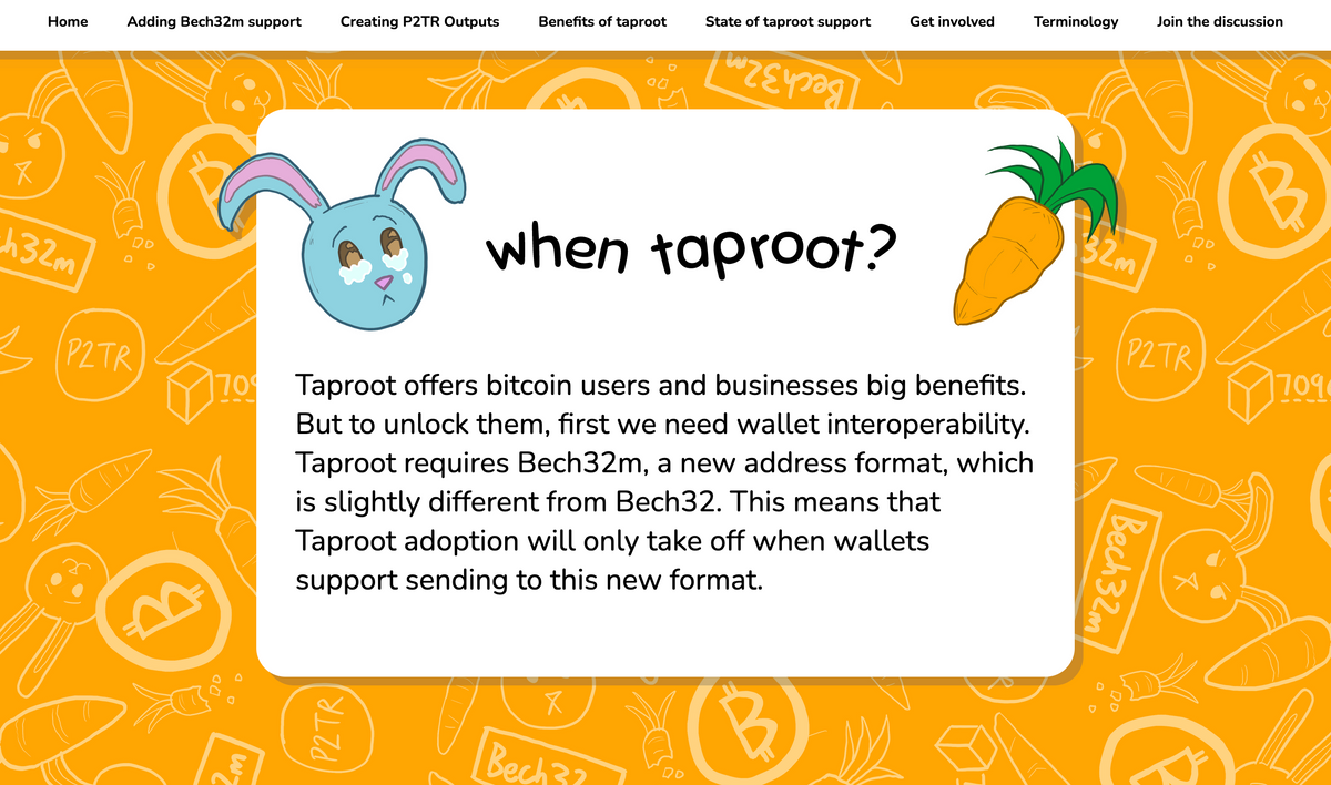 - The first lightning apps, wallets, and services with Taproot-based functionality are nearing completion. But one thing is holding back wide-scale Taproot adoption: apps and wallets that don’t support sending to Bech32m.